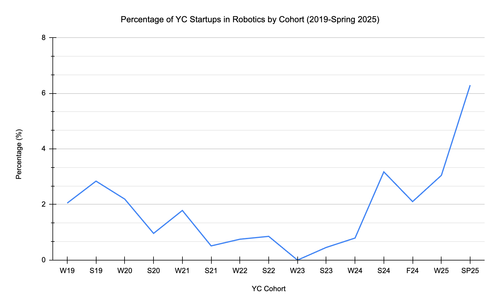 Note, don’t be fooled by just typing in “robot” to filter the companies. There are several companies with the word “Robot” in their name that don’t make actual physical robots. Also, I did not use data from the Summer 2025 cohort because at the time of this writing the list may be incomplete.