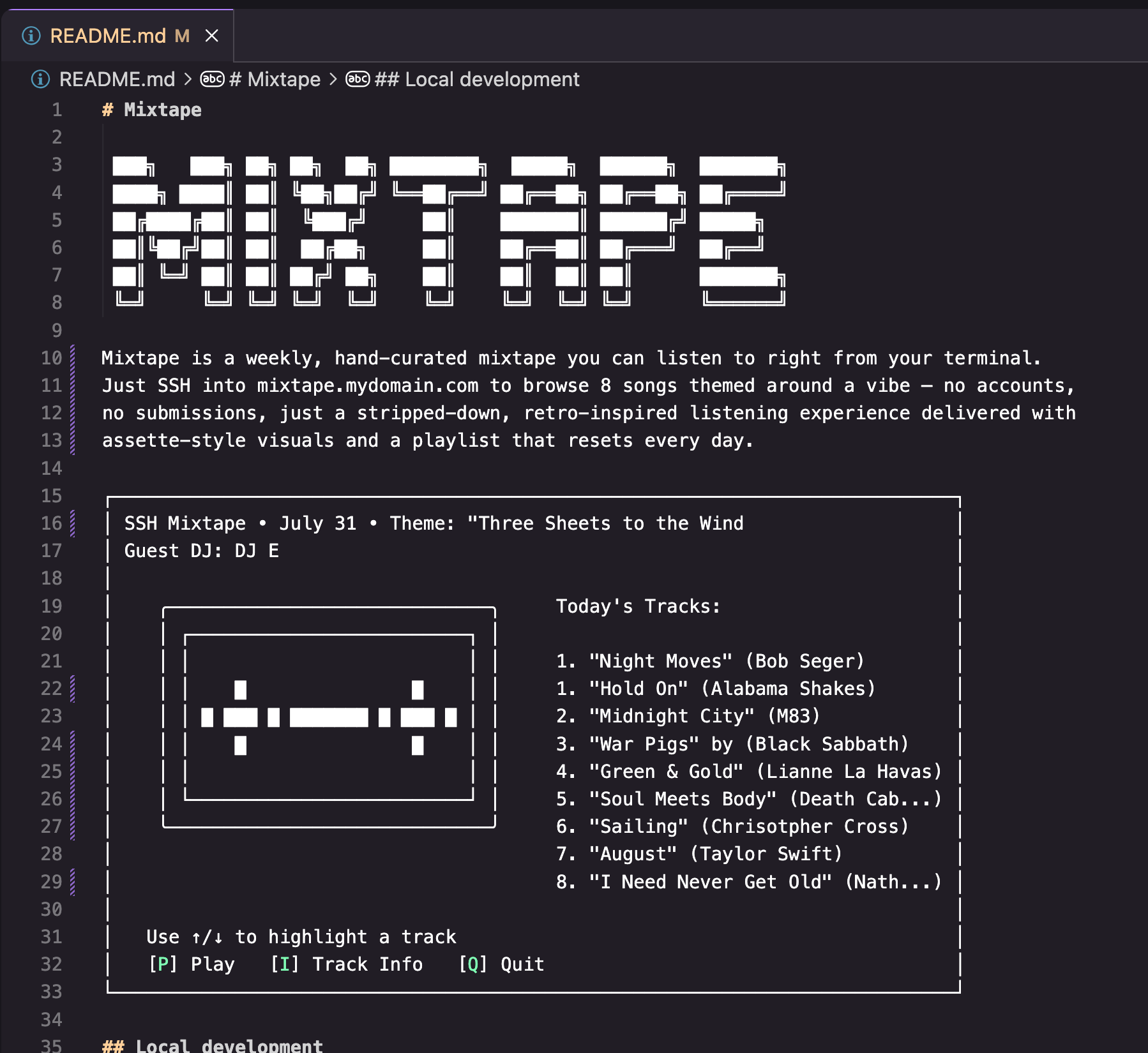 A service called Mixtape, where you can SSH into a machine to get a daily “mixtape” of songs around a certain theme. I knew curating a daily list of songs was going to be tough, but I figured I’d use AI for that. The demo came together quickly, which is a good thing, because it was only after connecting to it for the first time that I realized how bad this idea was: you can’t play songs in the terminal (if you even have the licenses or links to them) and you’ll run into concurrent connections limits with SSH pretty quickly if you want to scale.