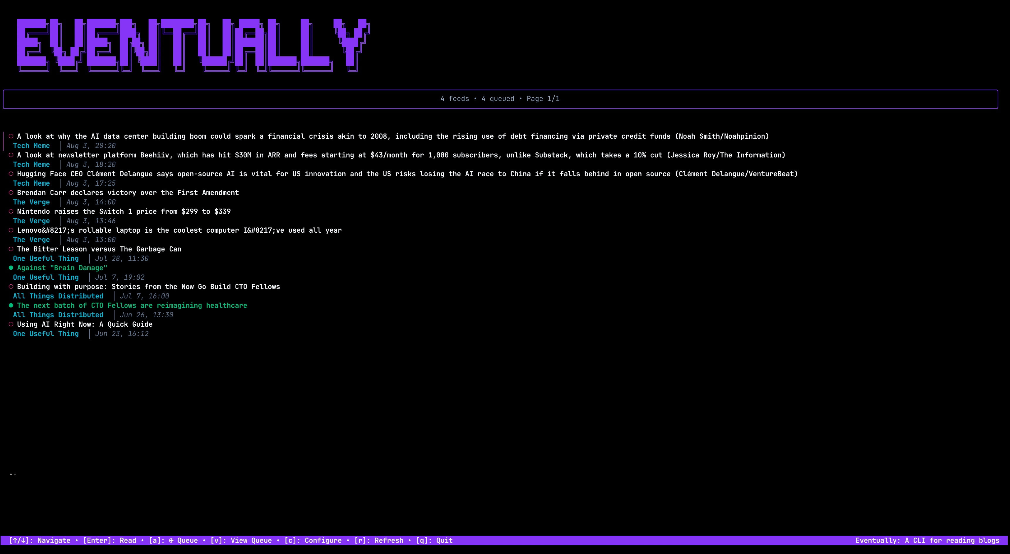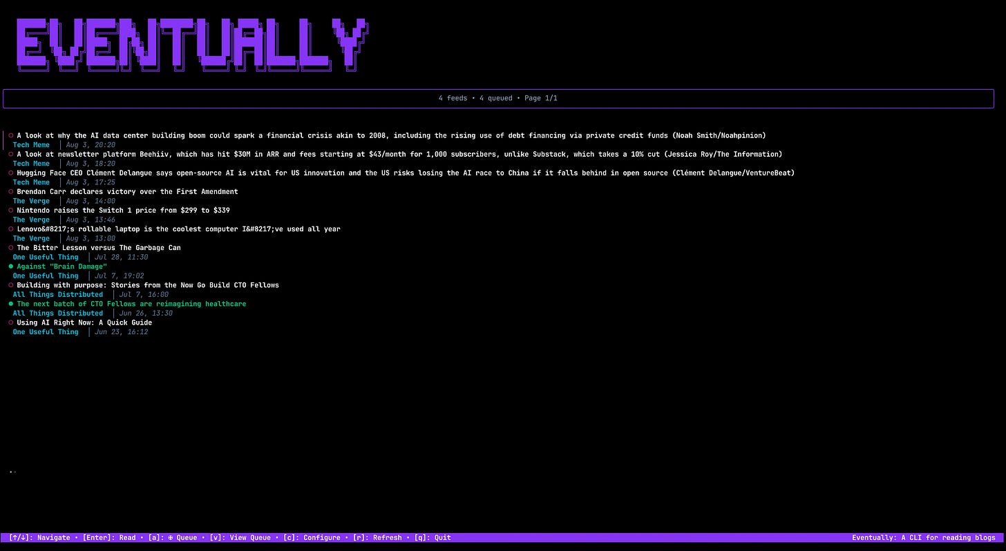A command‑line tool called “Eventually” for browsing, queuing, and reading blog posts directly in your terminal. This one took less than 90 minutes, and a lot of that was tweaking little things like colors or layout. Turns out these AI coding agents still have a lot of work to do on that front.