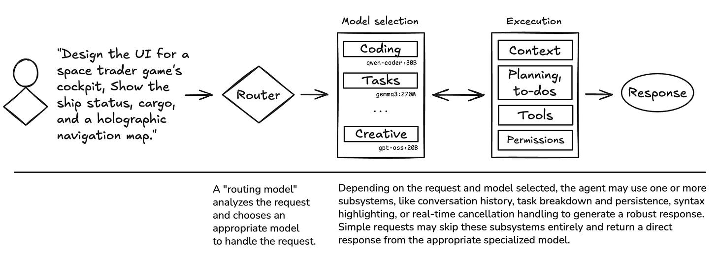 A robust agent needs to handle context, decide if it needs to access the filesystem, make system calls, make network calls, ask for clarification, break down complex tasks, manage conversation history across sessions, route requests to specialized models, handle request cancellation, persist task state, provide real-time feedback during long operations, and much more. And even though I’m building Shade to be a helpful coding assistant, it should also be able to handle non-coding requests.