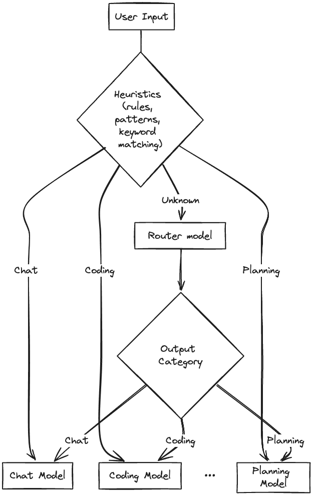For this project, I do something similar. I take a hybrid approach that combines hard-coded heuristics with model routing. If the heuristics fail to make a confident match, I fall back to a model to do inference on the input. This approach gives me the best of both worlds: sub-100ms routing for obvious cases, while still handling nuanced queries that require semantic understanding.