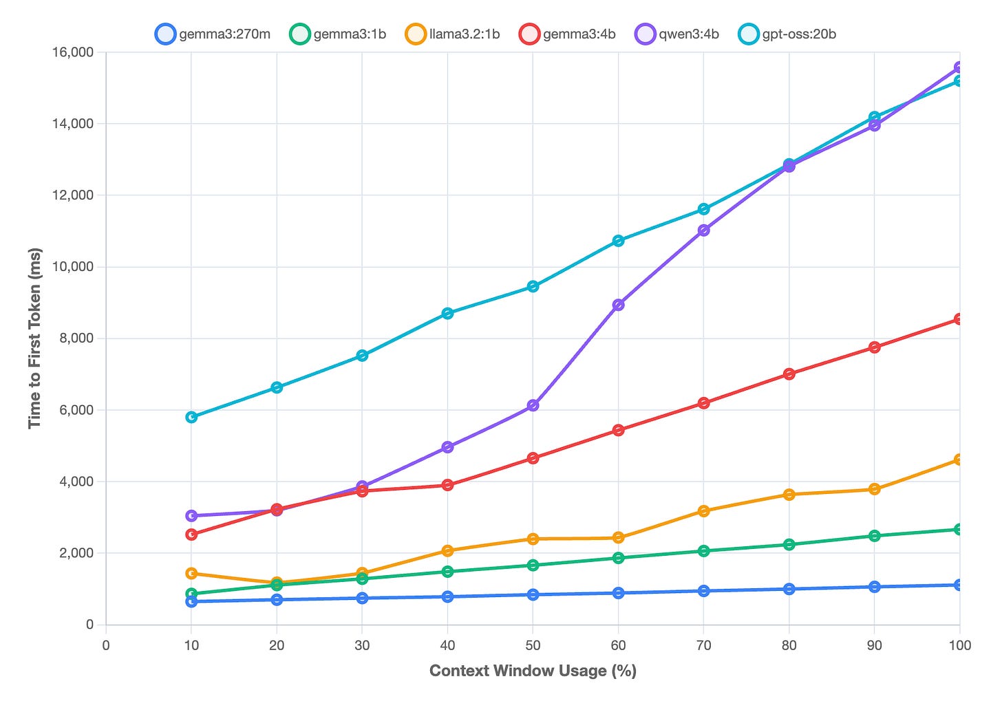 I used six different open-source models, and tested how fast each model produced the first token with the context window filled at increments of 10% (from 10% up to 100%). To ensure fair comparisons, I used identical pre-generated standardized technical text at varied token lengths for all models; repetitive but grammatically correct content to eliminate content complexity as a variable.
